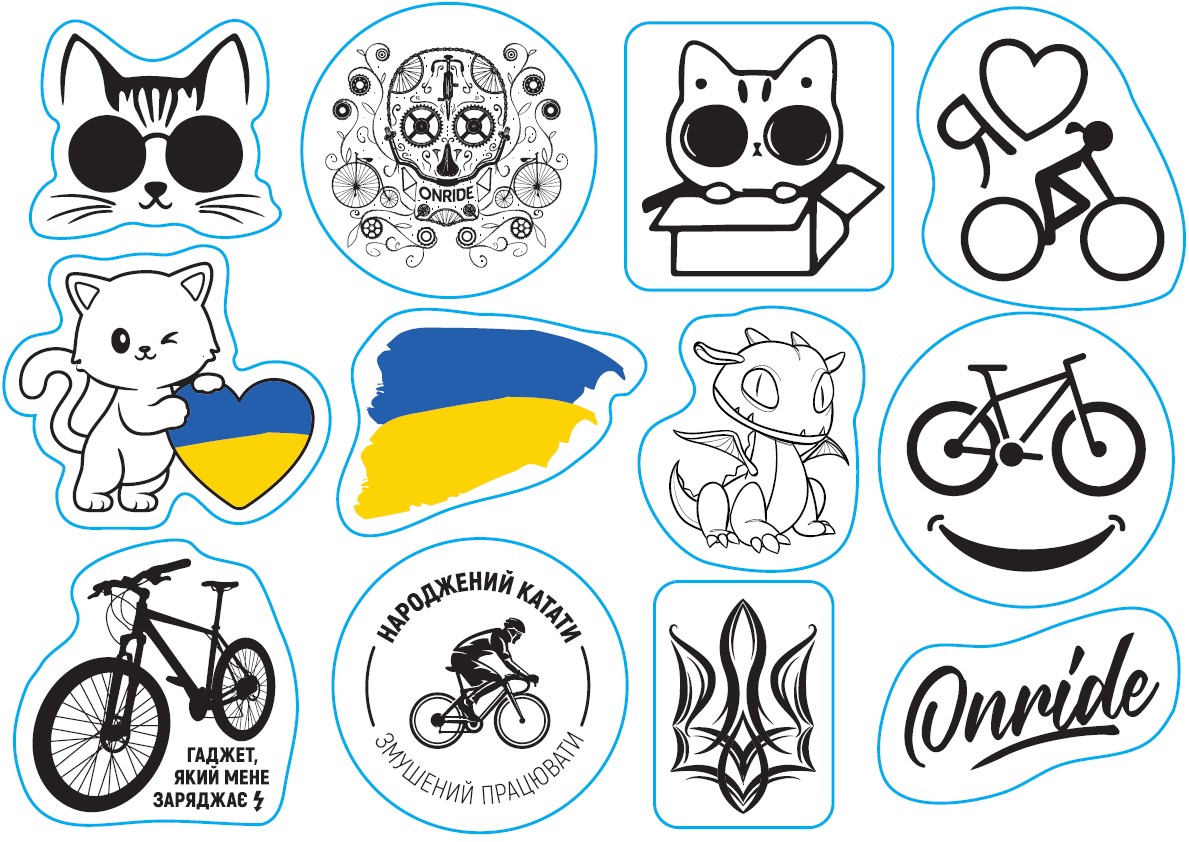 Наліпки мають авторський дизайн та відмінно тримаються на будь-якій твердій поверхні: рама велосипеда, шолом, самокат, рюкзак, скейт тощо. Перед приклеюванням поверхня повинна бути сухою та чистою для забезпечення максимальної фіксації. Завдяки гладкій структурі, наліпки стійкі до подряпин, вологи, механічних ушкоджень та ультрафіолету.