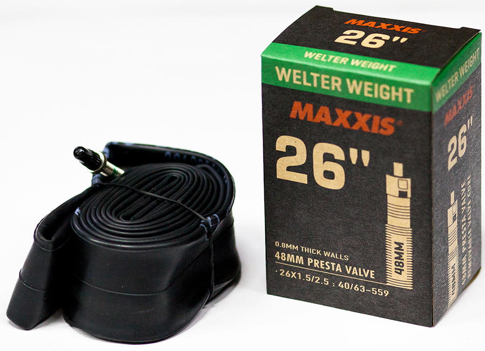 Камера Maxxis Welter Weight – це модель, спроектована для агресивних поїздок та гарантує максимальний термін служби. Представлена камера має середню вагу та підходять для всіх стилів катання. Завдяки товщині стінки 0.8 мм та своїй зносостійкості особливо вдалим її використання буде для тренувань. Модель має спортивний ніпель Presta довжиною 48 мм і постачається у картонній коробці.