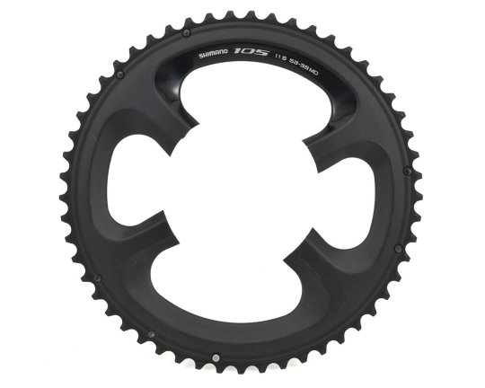 Зірка шатунів Shimano 105 FC-5800 Характеристики: • Матеріал: алюміній; • Кількість зубців: 53T; • BCD: 110мм; • Тип кріплення: 4-лапка; • Колір: чорний. Особливості: • Для систем Double з двома зірками; • Сумісна з 10-швидкісними трансмісіями • Сумісна з шатунами Shimano Tiagra FC-4700 / 105 FC-5800 / Ultegra FC-6800.