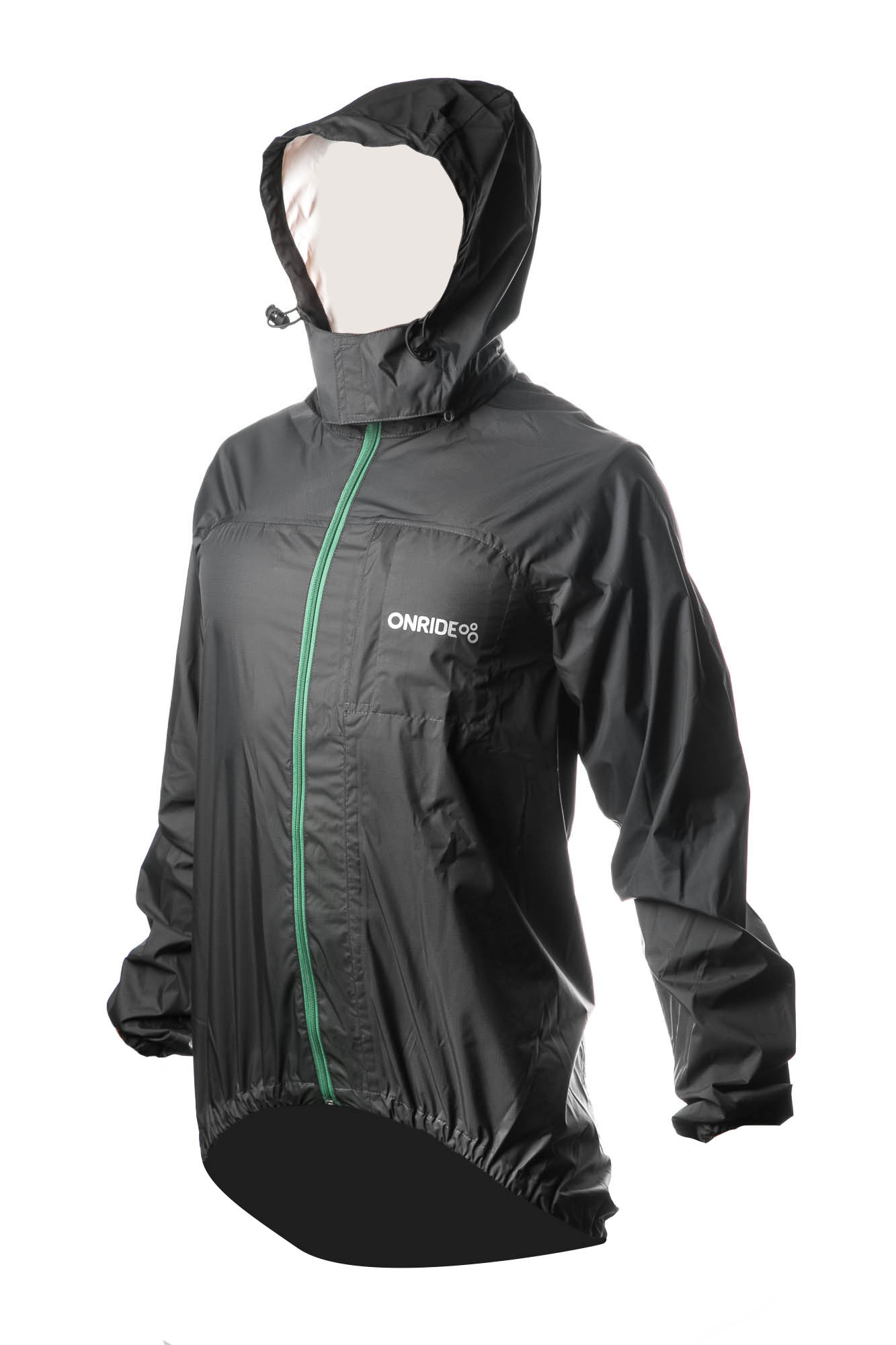 Дощовик з приталеним кроєм та повнорозмірною центральною застібкою "блискавка", рукави реглан, комір-стійка з м'якою тканинною внутрішньою стороною. Є внутрішня кишеня зліва на грудях з петелькою для навушників. Капюшон з еластичним шнуром з фіксаторами може відстібатися завдяки застібці "блискавка". Отвір з сіткою для вентиляції. Низ виробу та рукавів з еластичною гумовою тасьмою. Шви проклеєні та не пропускають вологу. Низ подовжений для зручності використання на велосипеді. На спині нашита світлоповертаюча смуга шириною 25 мм, а також є додаткові вставки на рукавах з високим коефіцієнтом світлоповертання.
